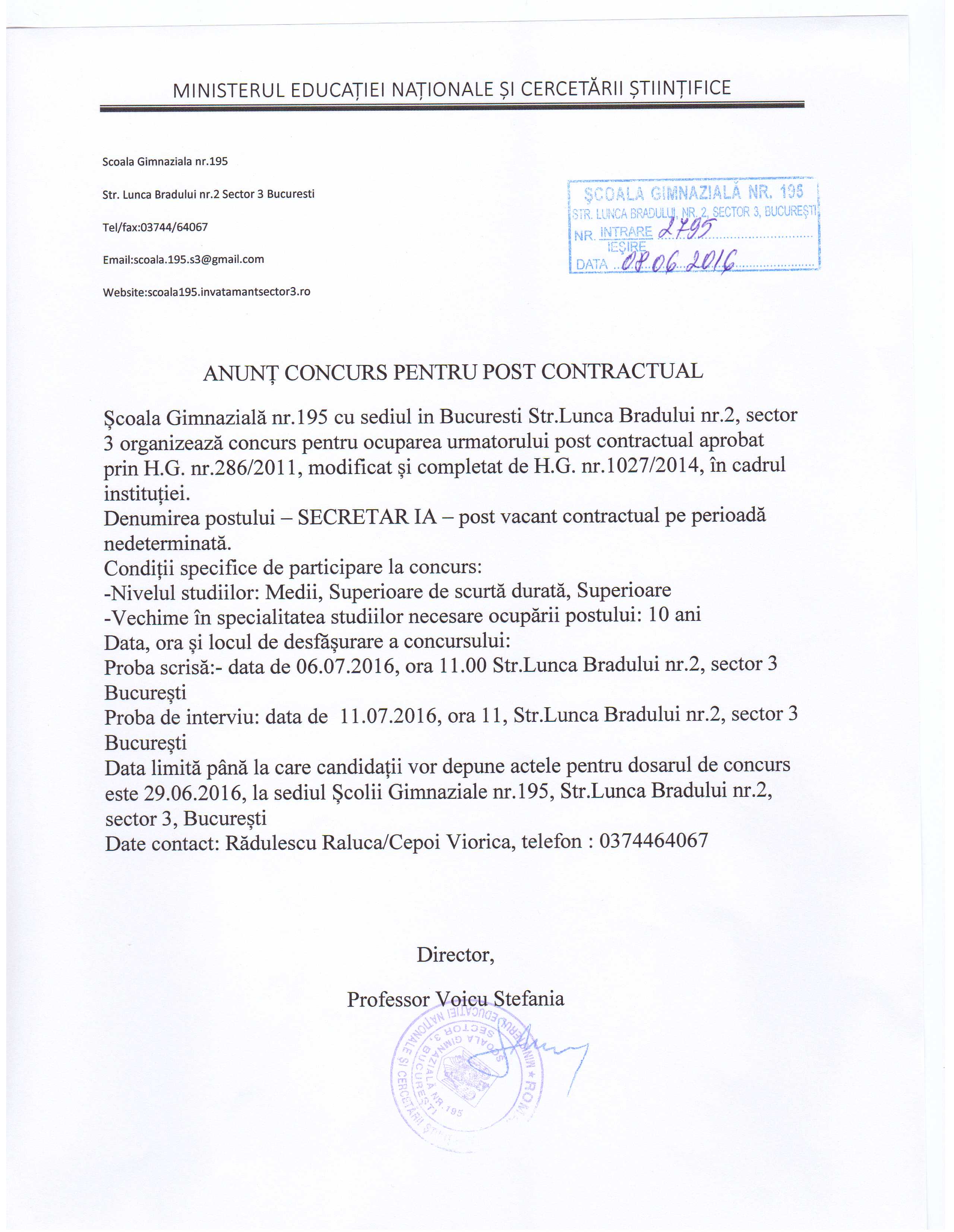 ANUNT – Suspendarea concursului pentru postul de Secretar, din 21.06.2016
