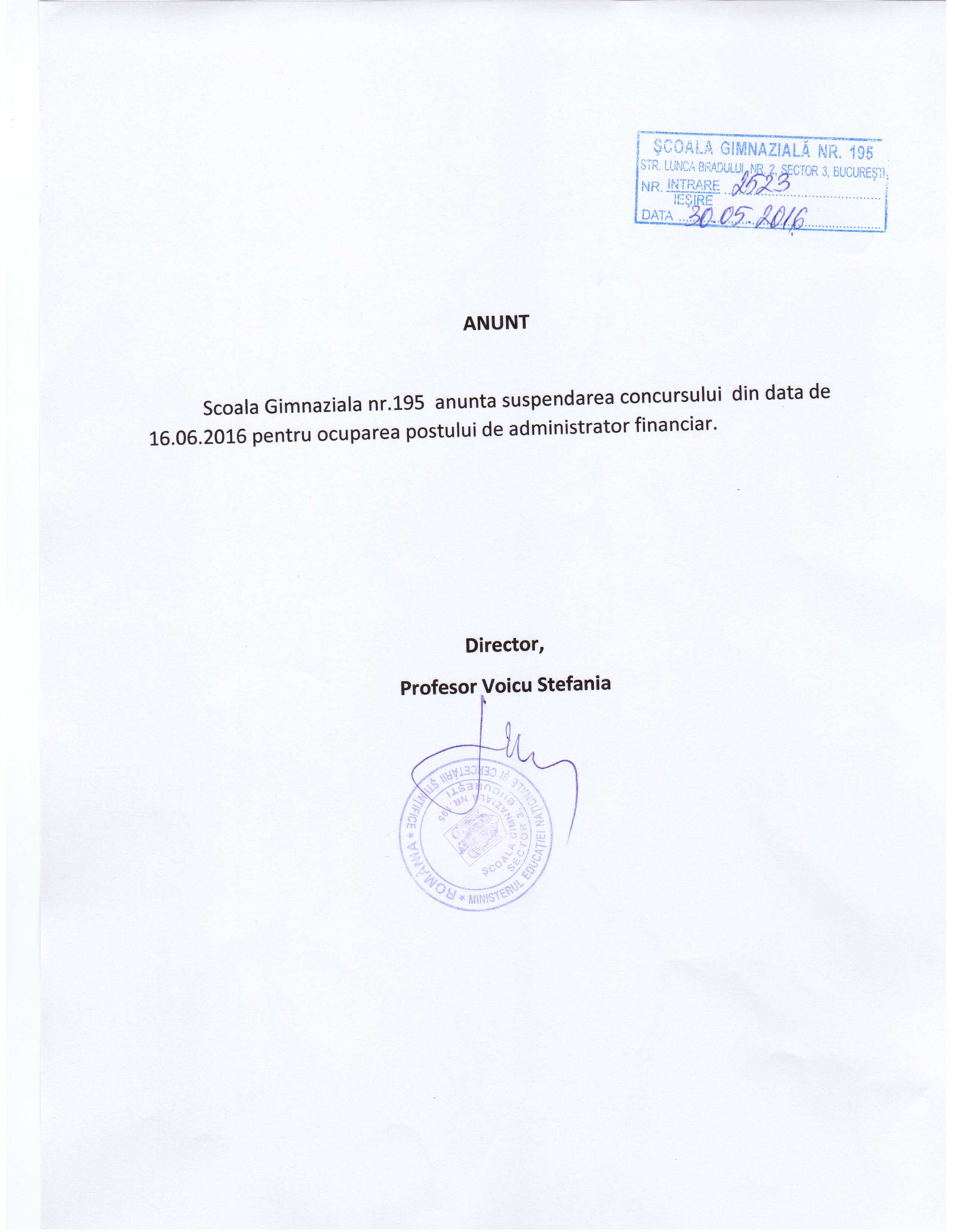 ANUNT- Suspendarea concursului pentru postul de Administrator Financiar, din 16.06.2016